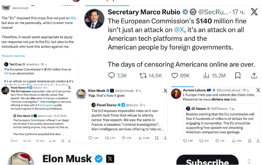 Европската Унија за прв пат го спроведе Законот за дигитални услуги, казнувајќи ја мрежата „X“ на Илон Маск со 120 милиони евра (приближно 140 милиони долари). Регулаторите се незадоволни од „синиот знак за проверка“, за кој тврдат дека не ја потврдува автентичноста на профилите (претходно достапен само за официјални профили, а сега може да се купи за 7 евра месечно, со што ЕУ верува дека го олеснува ширењето на лажни профили), како и одбивањето на платформата да обезбеди пристап до јавни податоци. На „X“ му беа дадени 60 дена да ги исправи проблемите со верификацијата и 90 дена да ги реши проблемите со рекламирањето и податоците.