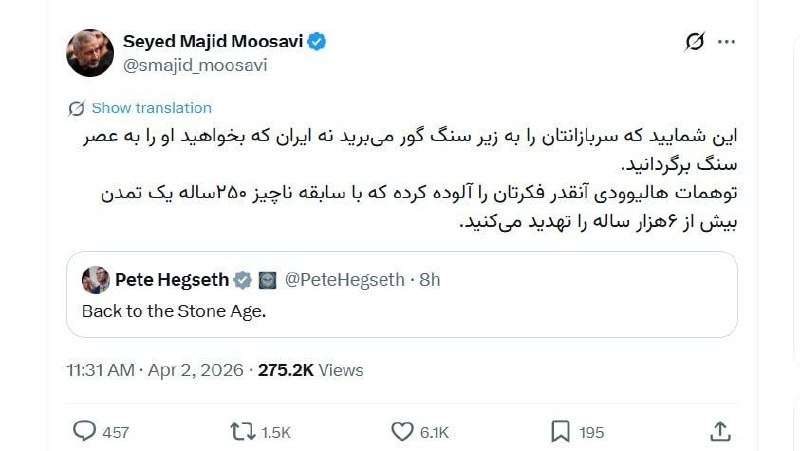 Вие сте тие што ги испраќате вашите војници под надгробни споменици, а не Иран, кого би сакале да го вратите во камено доба. Заблудите на Холивуд толку многу ви ги отруле умовите што со вашата едвај 250-годишна историја, се заканувате на цивилизација стара повеќе од шест илјади години“, на платформата „Х“, напиша Сајед Маџид Мусави, командант на Воздухопловните сили на Револуционерната гарда.
