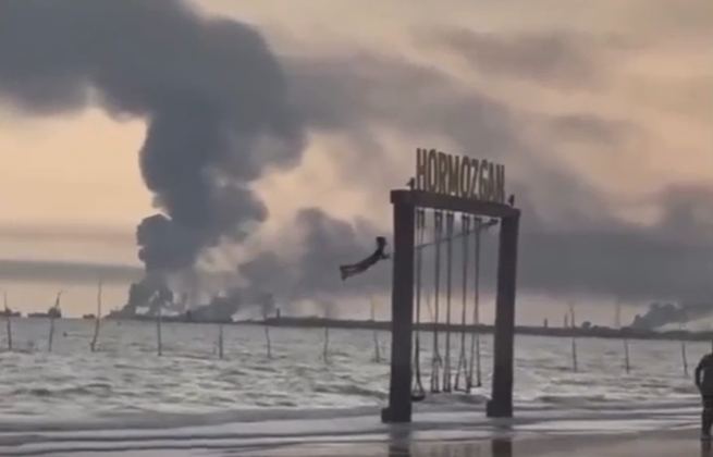 Таму, и покрај воениот виор што го обзеде регионот, едно иранско девојче ужива на лулашка на плажа, додека во позадина се гледа како горат „огновите на војната“.