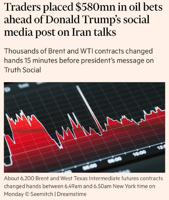 Според „Фајненшл тајмс“, околу 580 милиони долари во тргување со нафта беа реализирани 15 минути пред американскиот претседател Доналд Трамп да објави дека имал „продуктивни“ разговори со Иран.
