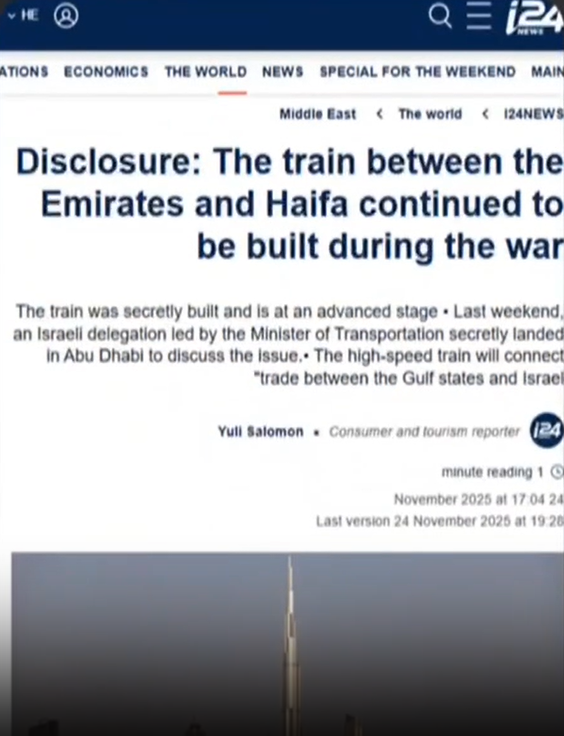Израелските медиуми, вклучувајќи ги „i24 News“, „Channel 15“ и „Yedioth Ahronoth“, известуваат дека изградбата на тајна железница што ги поврзува Обединетите Арапски Емирати (ОАЕ) и Израел продолжила и покрај тековниот геноцид во Газа. „Channel 15“ забележува дека проектот достигнал напредна фаза и дискретно се спроведувал во текот на целата војна.