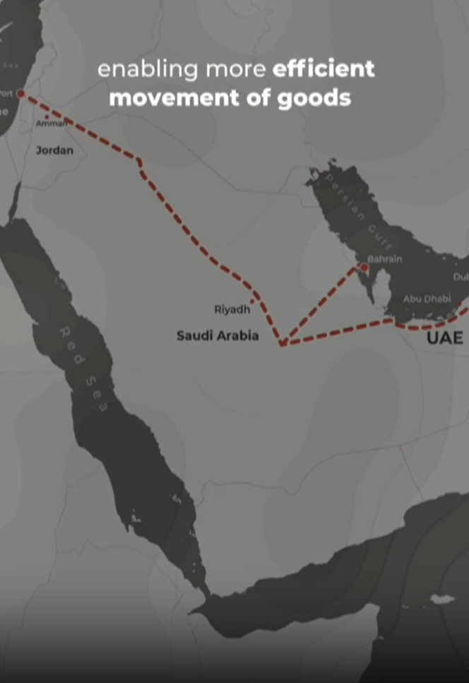 Проектот има за цел да создаде комерцијален коридор што ќе ја поврзува Азија со Европа, транспортирајќи стока од Индија до пристаништето Абу Даби, а потоа со брз воз преку ОАЕ, Саудиска Арабија и Јордан до пристаништето Хаифа за дистрибуција во Европа и САД.