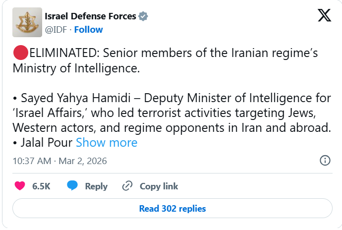 Израелските одбранбени сили (IDF) соопштија дека во почетната фаза од операцијата „Рикачки лав“ биле елиминирани високи членови на иранското Министерство за разузнавање, како и дека бил извршен напад врз седиштето на институцијата во Техеран.