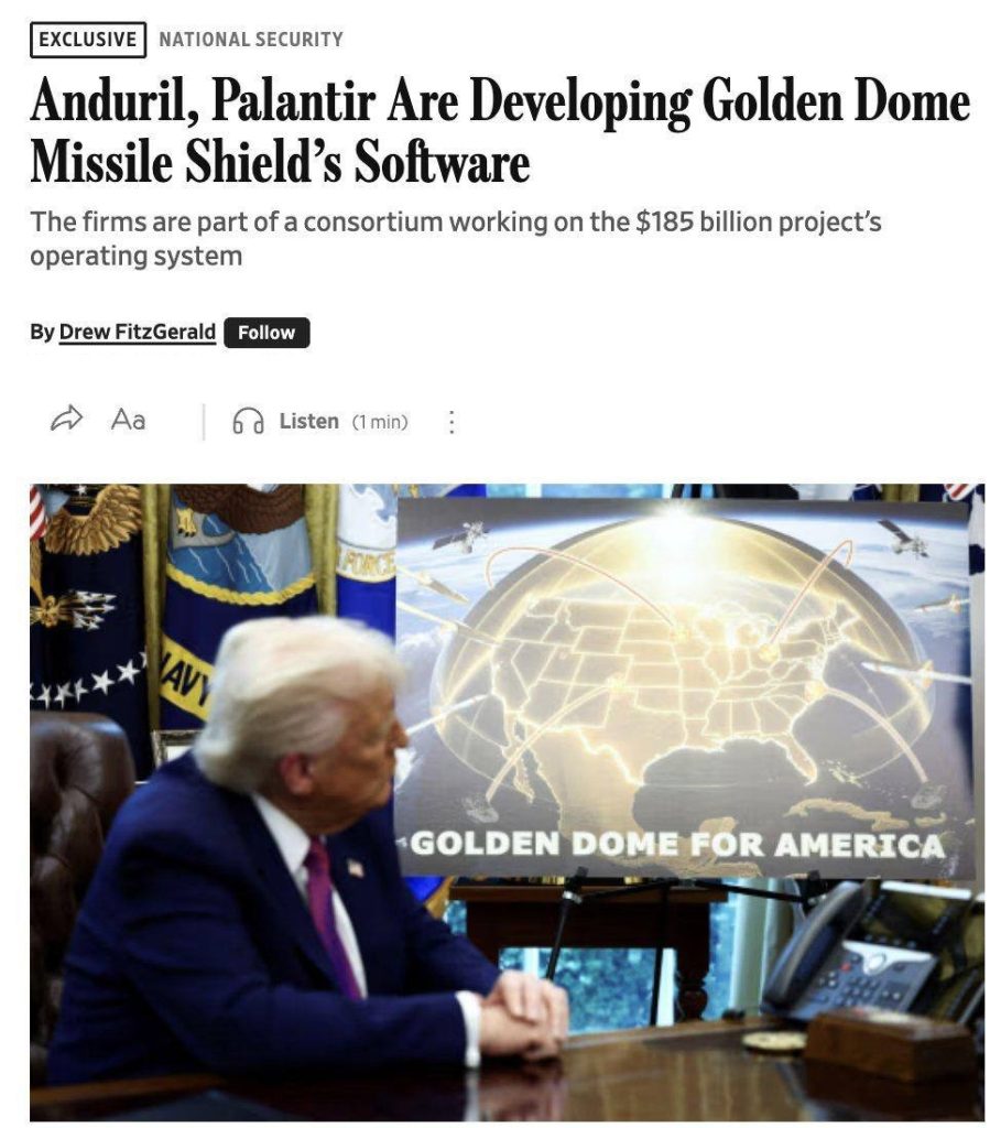 Технолошките компании „Андрил“ и „Палантир“ се дел од тимот што го создава основниот софтверски слој за системот за ракетна одбрана „Златна купола“, планиран од американскиот претседател Доналд Трамп, вреден 185 милијарди долари.