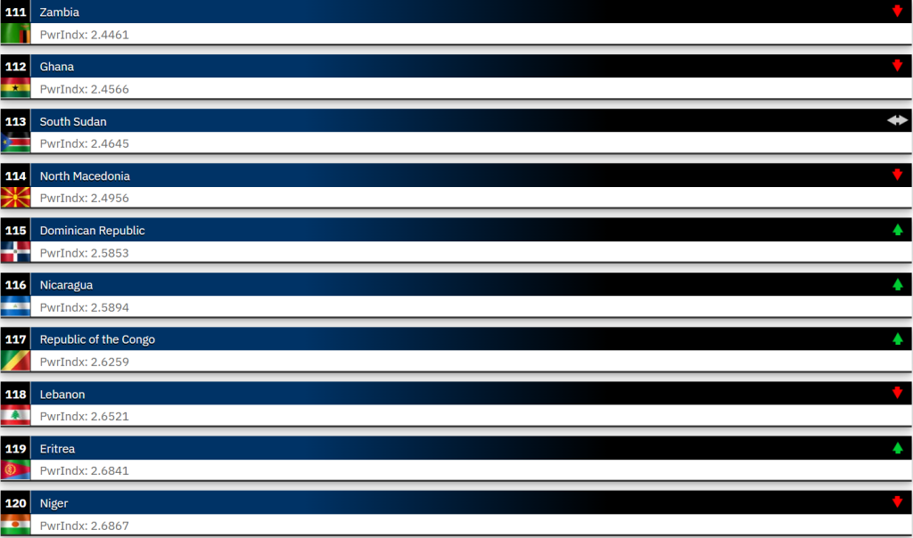 На ранг-листата се најде и армијата на Македонија, која е рангирана како 114 најмоќна сила во светот. Пред македонската армија сетие на Замбија, Гана и Јужен Судан, а веднаш зад нас се Доминиканската Република, Никарагва и Република Конго.