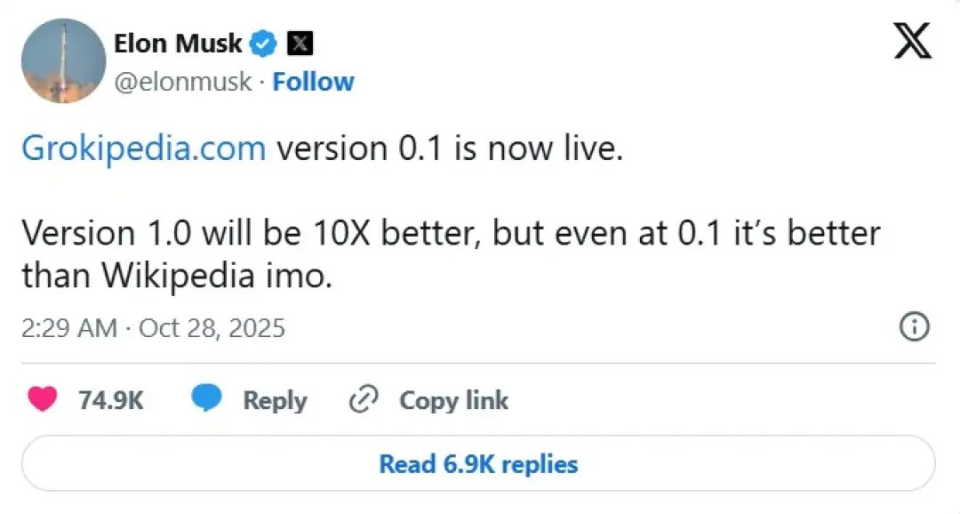 Во порака објавена на X, Маск вети дека наскоро ќе се појави верзијата 1.0, „десет пати подобра“ од 0.1, која веќе е „подобра од Википедија“.