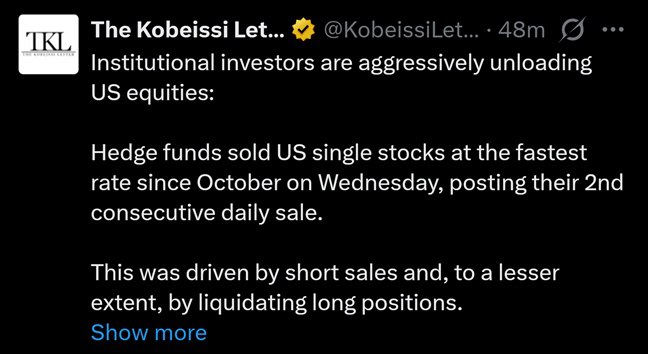 Хеџ фондовите продаваат акции на американските компании петти ден по ред со најбрзо темпо од октомври, — констатира аналитичката компанија „The Kobeissi Letter“ (ТКЛ)