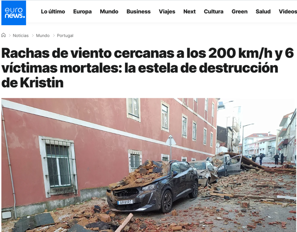 Олујата Кристин ја погоди Португалија и Шпанија, однесе најмалку пет животи и предизвика големи нарушувања во сообраќајот и секојдневниот живот поради силниот ветер, снегот и обилните врнежи, соопштија во четврток властите на двете земји.
