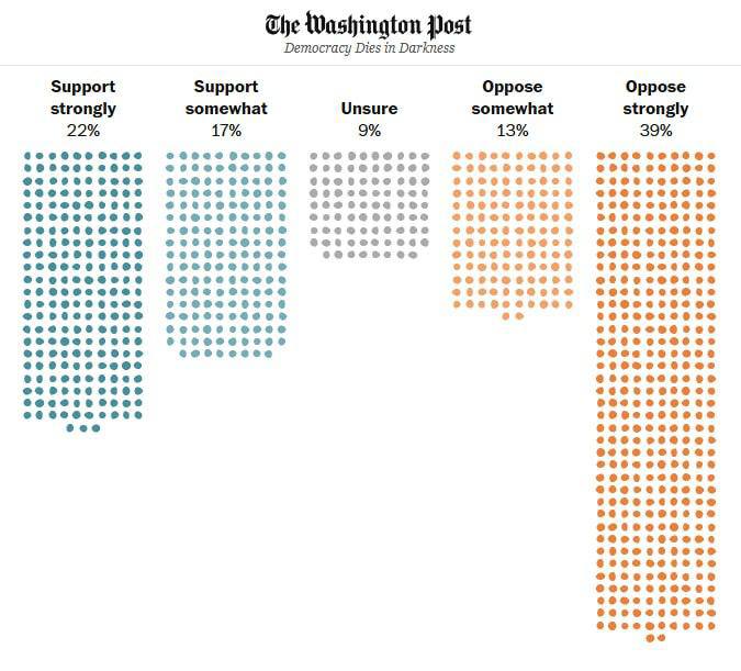 Резултатите од анкетата покажуваат дека нивото на поддршка кај републиканците е 81% (12% против), додека кај демократите е 9% (87% против).