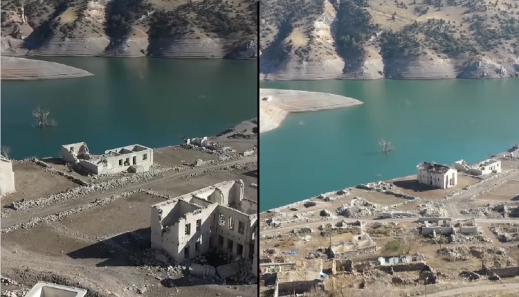 Градби на турско село, што било целосно потопено пред четири години, повторно излегоа на површина поради значителниот пад на нивото на водата на езерото Каракурт.
