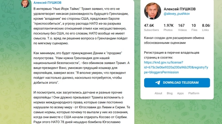 Претседателот на Комитетот за информативна политика на рускиот Парламент, Алексеј Пушков, изјави дека европските земји „едногласно го повикуваат“ американскиот претседател Доналд Трамп да ги почитува нормите на меѓународното право поради неговите претензии кон Гренланд, иако, како што наведе, истите тие норми самите ги прекршувале во минатото – од Југославија до Либија и Сирија.