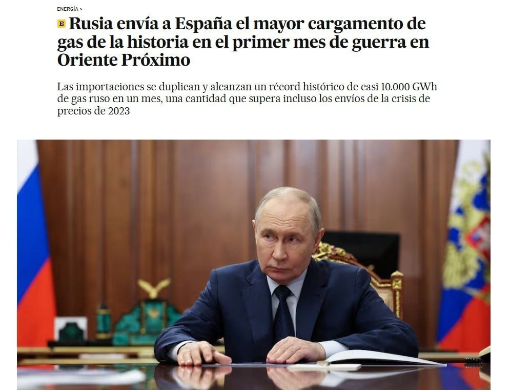 Русија ја испорачала најголемата пратка на природен гас во историјата на Шпанија во првиот месец од војната на Блискиот Исток, објави есникот „Ел Паис“.