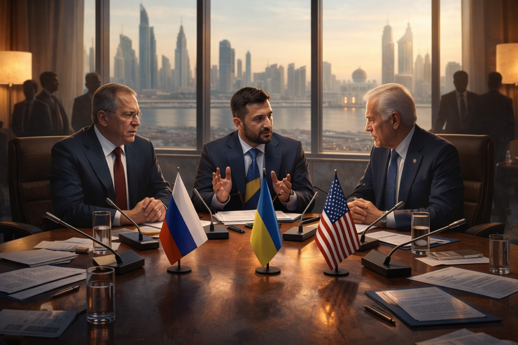 Руски, украински и американски претставници вчера се состанаа во Абу Даби во прв ваков формат со цел да ги разгледаат условите за завршување на четиригодишната војна во Украина. Москва продолжува да инсистира Киев да ги повлече своите сили од Донбас, јавија светските агенции.
