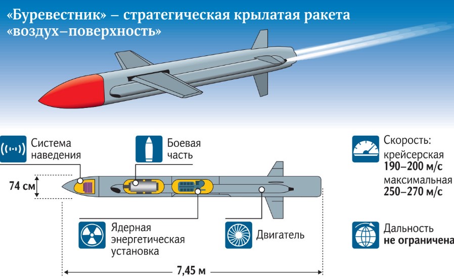 Техничките карактеристики на „Буревестник“ овозможуваат да се користи со загарантирана точност против високо заштитени локации на кое било растојание“, рече Герасимов.