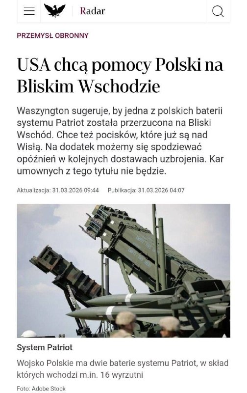 Администрацијата на американскиот претседател Доналд Трамп побарала од Полска да врати батерија од ракетните системи земја-воздух „MИM-104 Патриот ПАК-3“ за да биде распоредена на Блискиот Исток.