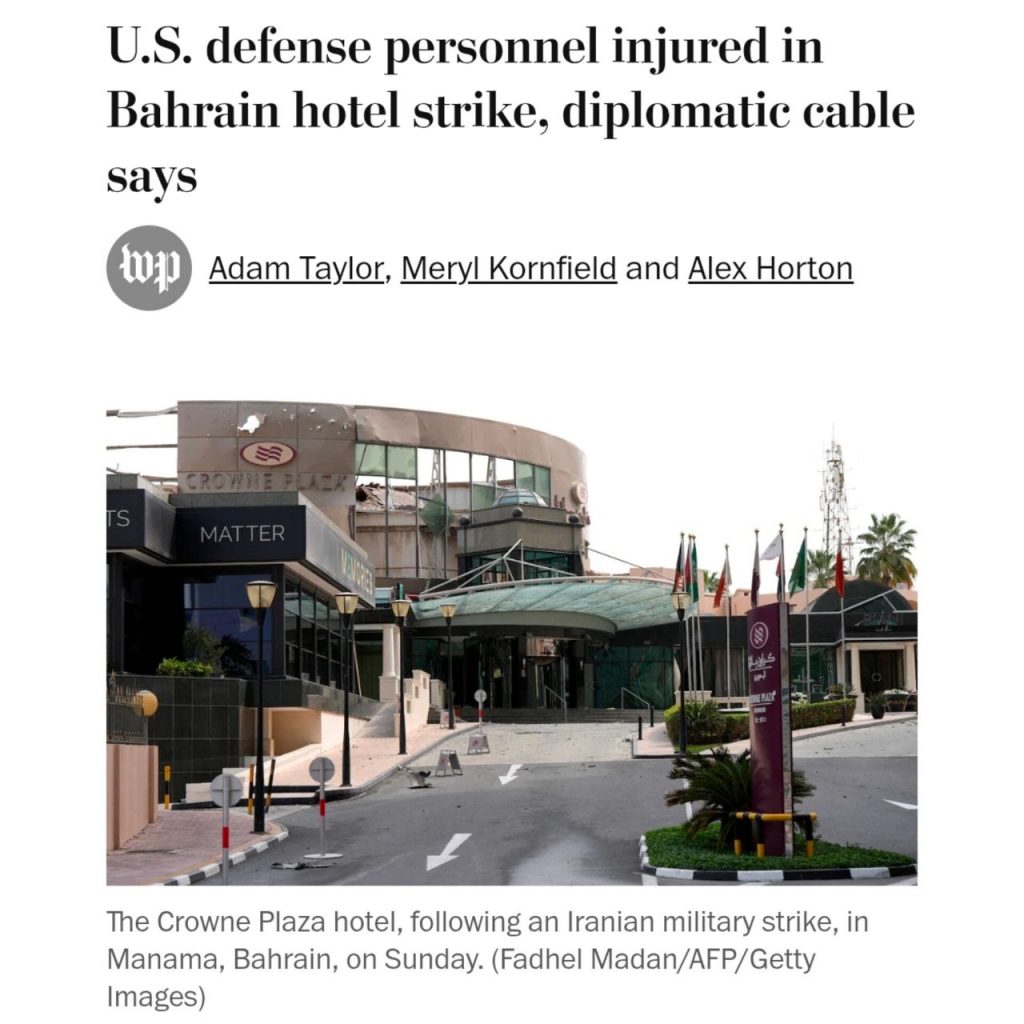 Ирански дрон погодил хотел во Бахреин, при што се повредени двајца вработени во Министерството за одбрана на САД, објави „Вашингтон пост“ според прегледан допис од Стејт департментот.