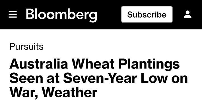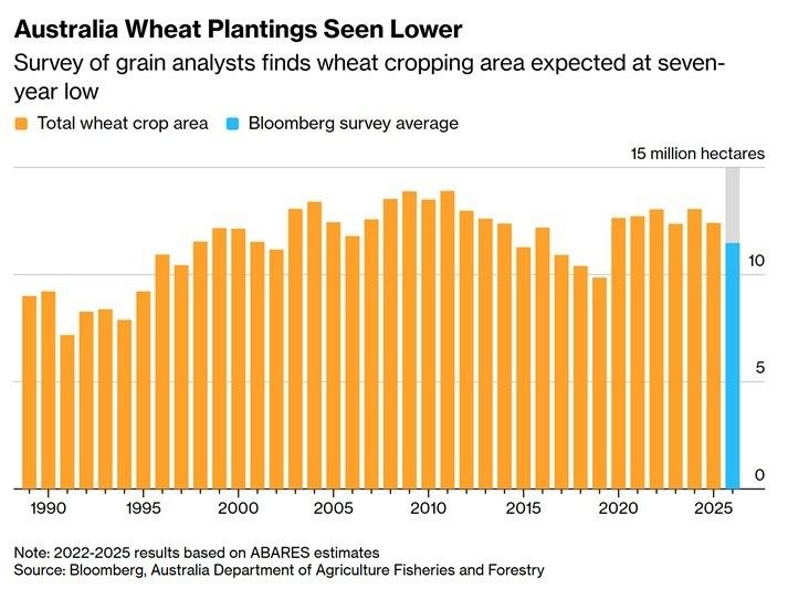 Според анализата на изданието, намалувањето на земјиштето засадено со пченица во Австралија паднало за 7,5%, на 11,5 милиони хектари. Причина за таквиот пад е недостиг на гориво и ѓубриво. Ова е најниското ниво од 2019 година, забележува „Блумберг“.