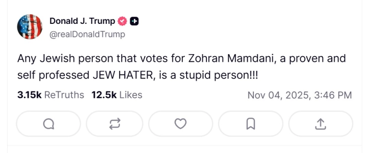 Секој Евреин што гласа за Зохран Мамдани, докажан и самопрогласен мразител на Евреи, е глупав човек, напиша американскиот претседател на својата платформа Truth Social.