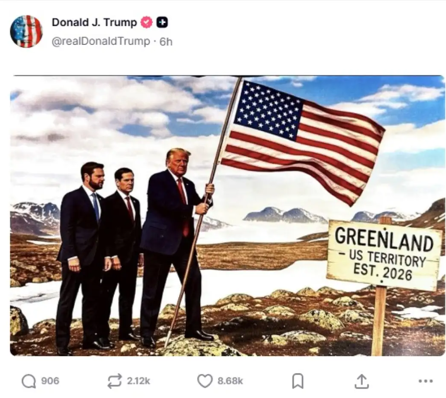 На друга фотографија, споделена денеска, Трамп е прикажан како поставува американско знаме на Гренланд, заедно со потпретседателот Џеј Ди Венс и државниот секретар Марко Рубио. На натписот стои: „Гренланд – територија на САД, основана 2026“.