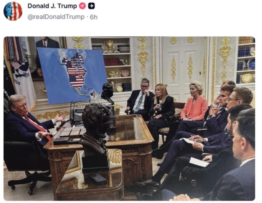 На една од фотографиите Трамп е прикажан во Овалната соба со европски лидери покрај табла со мапа на западната хемисфера, на која САД, Венецуела, Гренланд и Канада се прикажани во црвено-бело-сини бои.