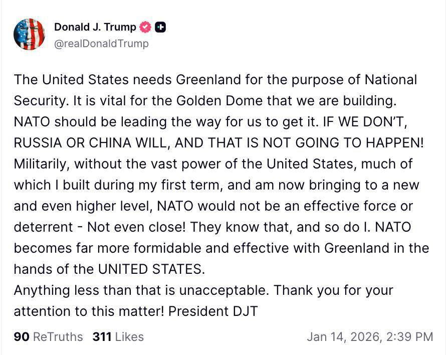 Претседателот на САД, Доналд Трамп, на социјалната мрежа „TruthSocial“ напиша дека Гренланд е од витално значење за националната безбедност на земјата и „Златната купола“ што ја градат Американците.