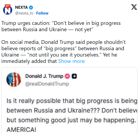 Дали навистина е можно да е постигнат голем напредок во мировните преговори помеѓу Русија и Украина? Не верувајте додека не видите, но можеби нешто добро се случува. Бог нека ја благослови Америка, напиша Трамп.