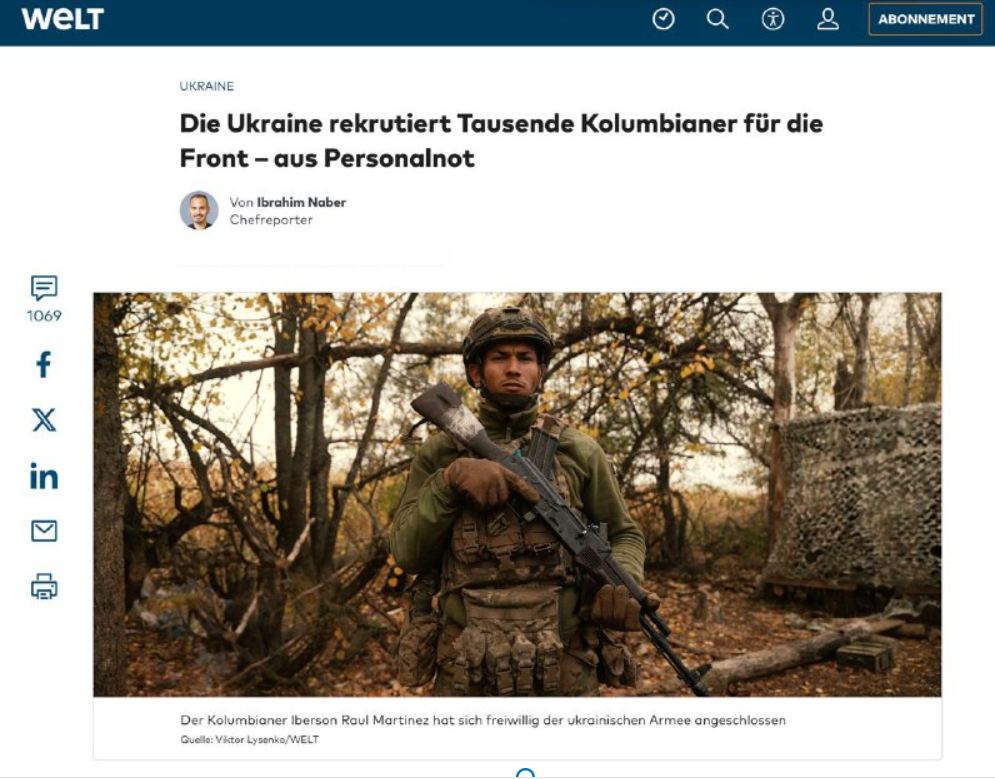 Во украинските вооружени сили во секој даден момент се борат околу две илјади Колумбијци, а има и цели чети формирани од Јужноамериканци, објавува германскиот весник „Велт“.