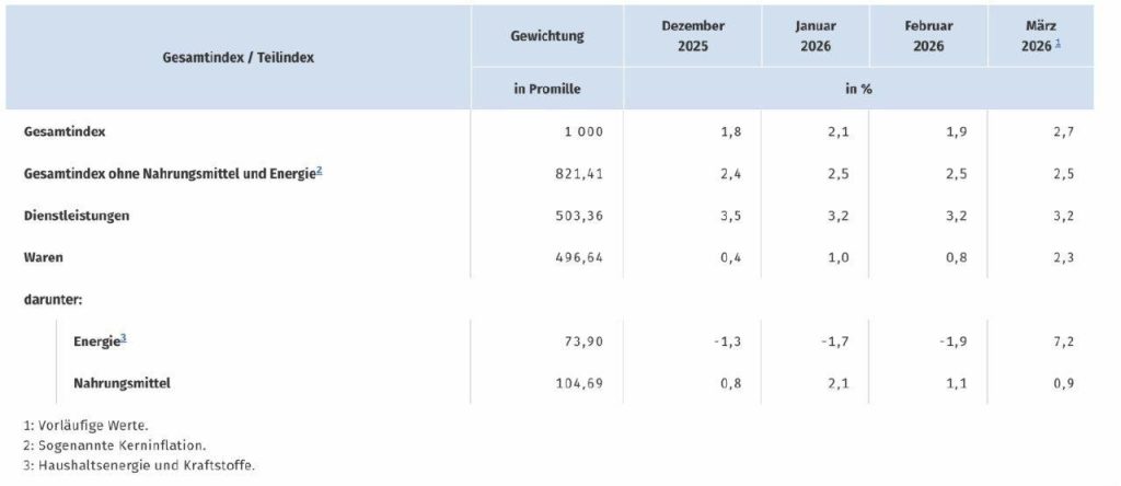 Според Федералниот завод за статистика, потрошувачките цени се зголемиле за 1,1 процент во споредба со претходниот месец, февруари 2026 година. Се очекува основната инфлација – односно зголемувањето на цените без високо нестабилниот сектор за храна и енергија – да достигне 2,5 проценти. Зголемувањето на цените на енергијата е особено впечатливо. Се очекува тие да бидат за 7,2 проценти повисоки во март во споредба со истиот месец минатата година. Ова е прво зголемување на цените во енергетскиот сектор на годишно ниво од декември 2023 година.