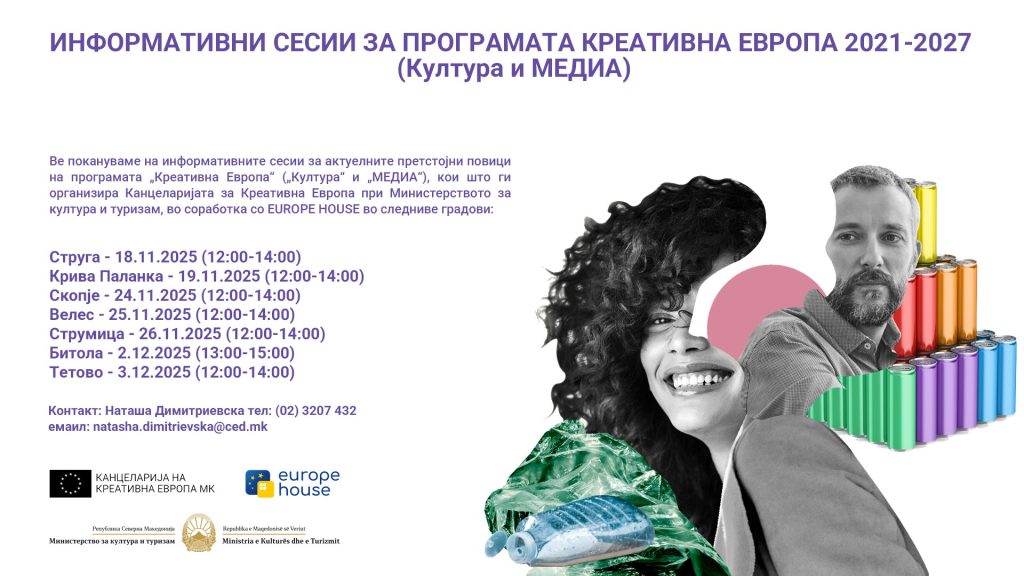 Канцеларијата за Креативна Европа при Министерството за култура и туризам информира дека организира информативни сесии во просториите на „Europe House“ во следниве градови:
