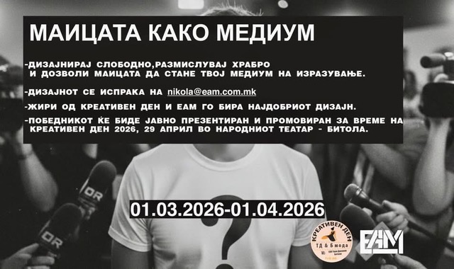 „Креативниот ден“, препознатливиот настан во Битола во организација на Божиловиќ продукција во соработка со ЕАМ , текстилната компанија од Штип, го започна новиот младински креативен конкурс за дизајн на маица, наменет за средношколци кои сакаат преку визуелен израз и порака да го претстават својот став, идентитет и креативност.