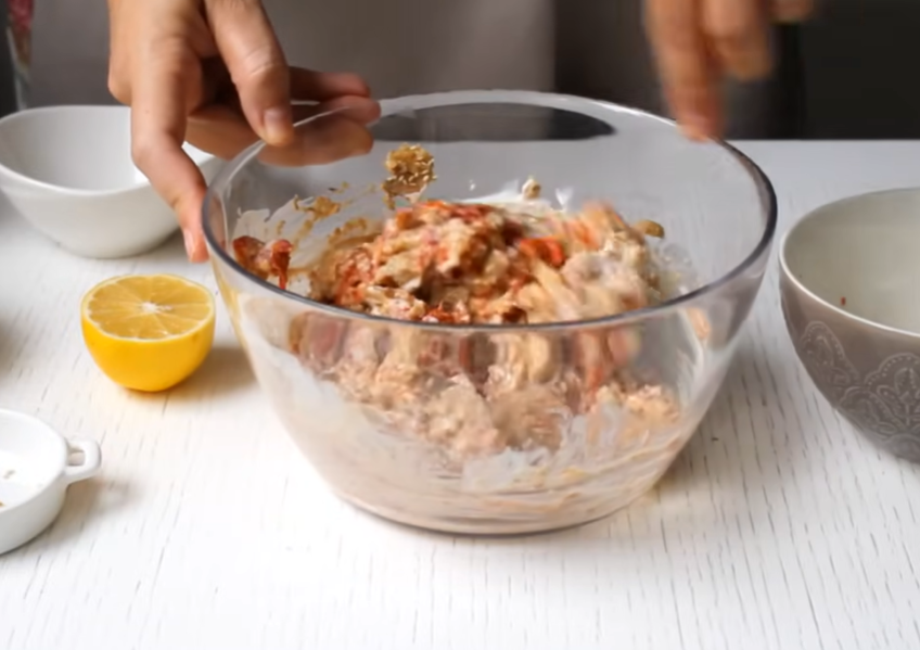 Можете да користите од есенските печени пиперки кои сте ги складирале во замрзнувач, излупени, исчистени од дршките и семето и исцедени од сокот кој го пуштиле. Потребни ви се 200 г исчистени, испечени пиперки. Исечете ги на ситни коцкички. Печурките исцедете ги од маринадата (тие се полни со сокови, па истискајте ги за да излезе вишокот), исечкајте ги ситно и додајте ги во пиперките. Зачинете со сол и лимонов сок. Потоа додајте ги мелените кикирки кои се маринирани/печени само во сол, а не пржени во масло, 2 супени лажици пропжен сусам (во сува тава колку да замириса).На крај додајте го соиниот јогурт кој е без додаток на масло. Оваа салата е многу здрава и не содржи масти ниту мајонези и нема потреба од додавање на други состојки, зашто сама по себе е многу вкусна. Евентуално, секој по желба може да додаде сосем малку сенф, ако го сака тој вкус. Салатата добро измешајте ја и претурете ја во садот за послужување. Одозгора посипете една лажица сусам.