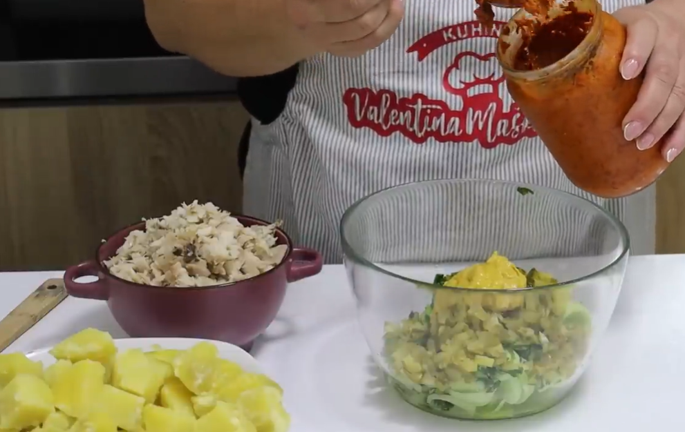Компирите исчистете ги и исечкајте ги на крупни коцки, па сварете ги во посолена вода. Потоа исцедете ги од водата и оставете да се оладат. Згответе ја рибата и извадете ги коските. Следно, иситнете го празот, залијте го со сок од лимон, додајте ситно сечкани краставички и магдонос, а потоа додајте ајвар, сенф и зачини. Во подлабок сад измешајте: сварени компири, исчистена и иситнета риба, празот измешан со зачините и краставичките.
