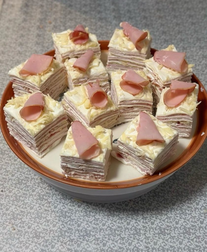 Измешајте павлака, сирење и мајонез. Прелијте ја секоја кора со тој фил. Наредете шунка за пица врз првата кора, повторно малку премачкајте ја и потоа ставете го ренданото сирење. На втората кора, само ја редите печеницата и така додека не го потрошите материјалот. Завршете со сирењето и повторно ставете го кашкавалот одозгора.
