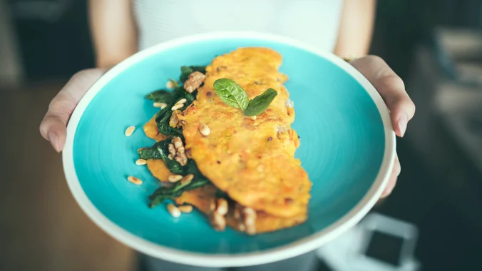 Знаете дека омлетот е готов кога нема повеќе течност. Потоа преместете го тој мал куп јајца на чинија.