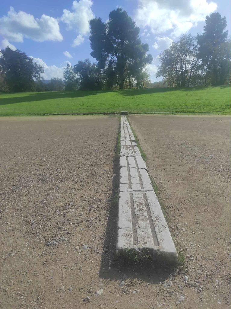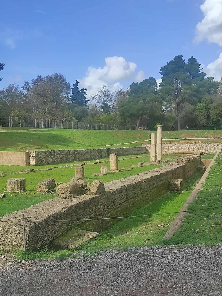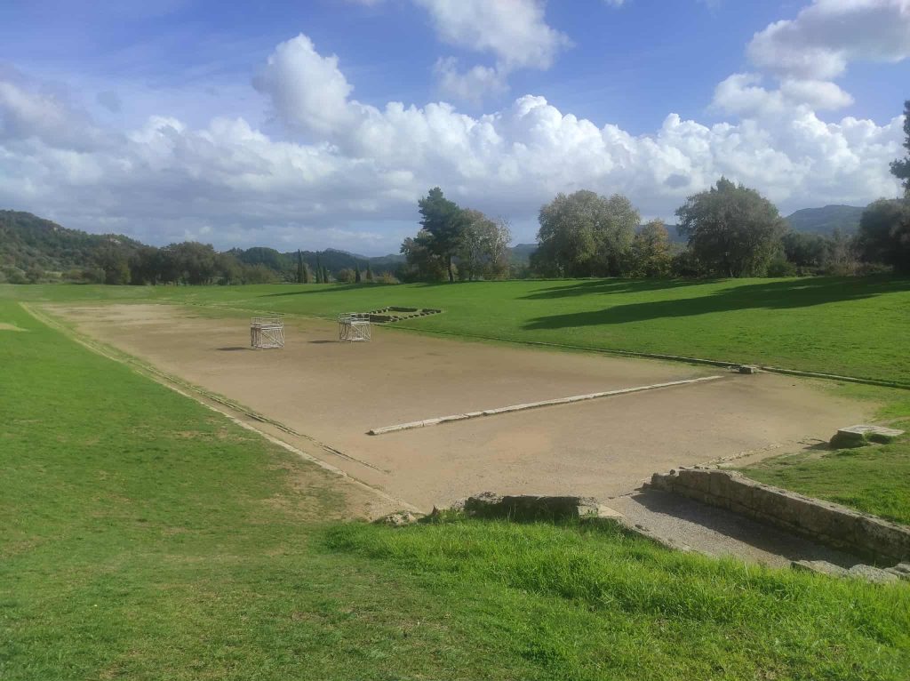 Друга локација што е особено значајна е стадионот. Тоа е во основа поле со почетни и крајни линии обележани со попречни рабници. Спортистите влегувале под свод од засводен коридор на почетокот. Гледачите седеле главно на косите страни на полето. Кога Атина беше домаќин на Летните олимписки игри во 2004 година, натпреварите во фрлање ѓуле за мажи и жени се одржаа на стадионот Олимпија. Иако фрлањето ѓуле не е меѓу модерните атлетски настани со потекло што датира од античките Олимписки игри, беше избрано како нешто што бара најмалку нарушување на чувствително археолошко наоѓалиште.