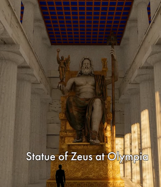 Олимпија била позната и по гигантската статуа на Зевс изработена од слонова коска и злато на дрвена рамка, која била култна слика во неговиот храм, изработена од Феидија. Многу блиску до храмот на Зевс, во кој се наоѓала оваа статуа, студиото на Феидија било ископано во 1950-тите. Доказите пронајдени таму, како што се алатките на скулпторот го потврдуваат ова мислење.