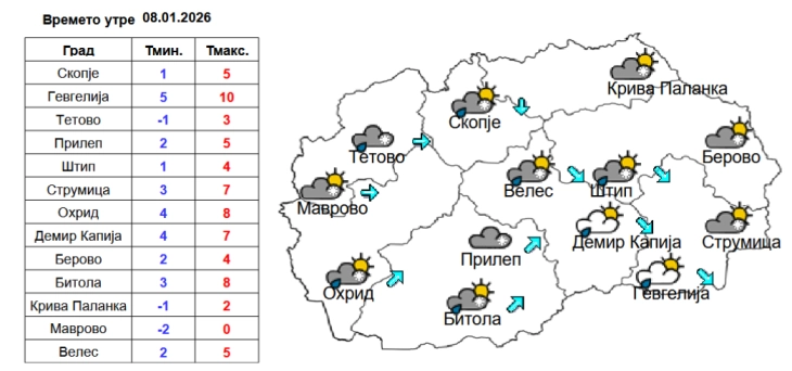 Во Скопје времето ќе биде променливо облачно со повремен дожд, особено кон крајот на денот и во текот на ноќта. Ќе дува умерен ветер од јужен правец. Температурата ќе достигне до 9 степен.