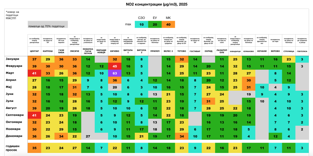 Податоците кои ги споделија од О2 покажуваат дека концентрациите на PM2.5 во зимскиот период достигнуваат и до 18 пати повисоки вредности од оние препорачани за заштита на здравјето, додека надвор од грејната сезона тие се до 3,5 пати повисоки. Слична состојба е регистрирана и кај PM10 честичките, со зимски концентрации до 7,5 пати над здравствените граници.