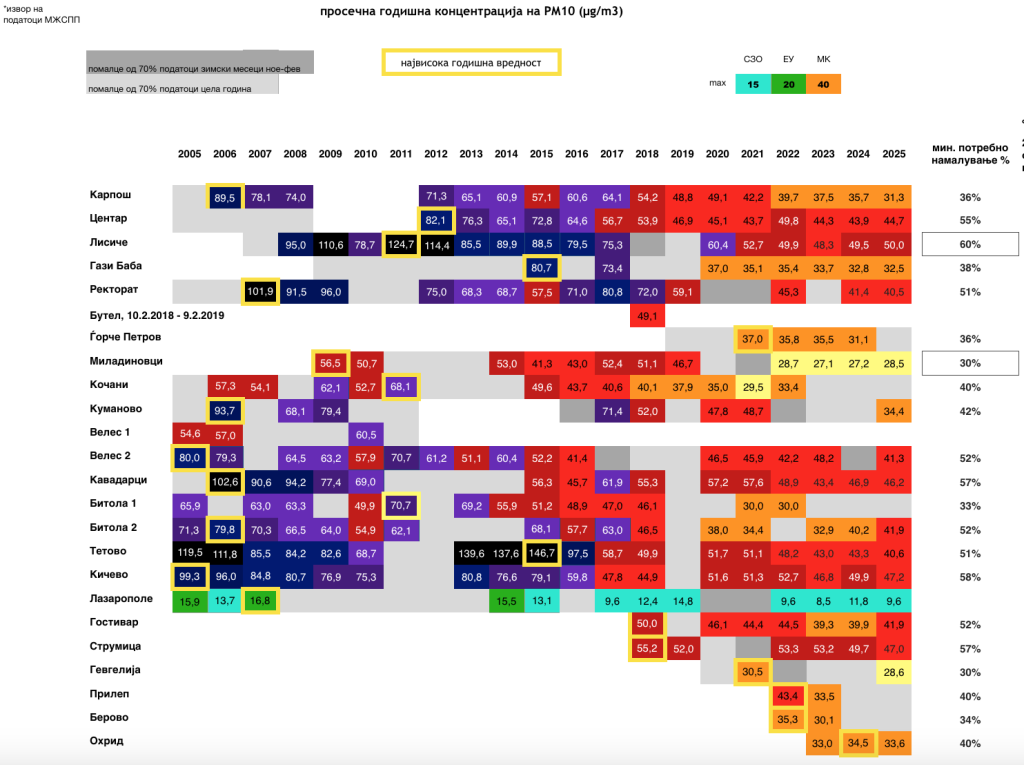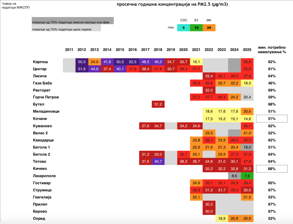 Поразителен е податокот дека ниту Лазарополе, кое се смета за референтно чисто подрачје, не ги исполнува здравствените препораки за PM2.5 во текот на целата година.