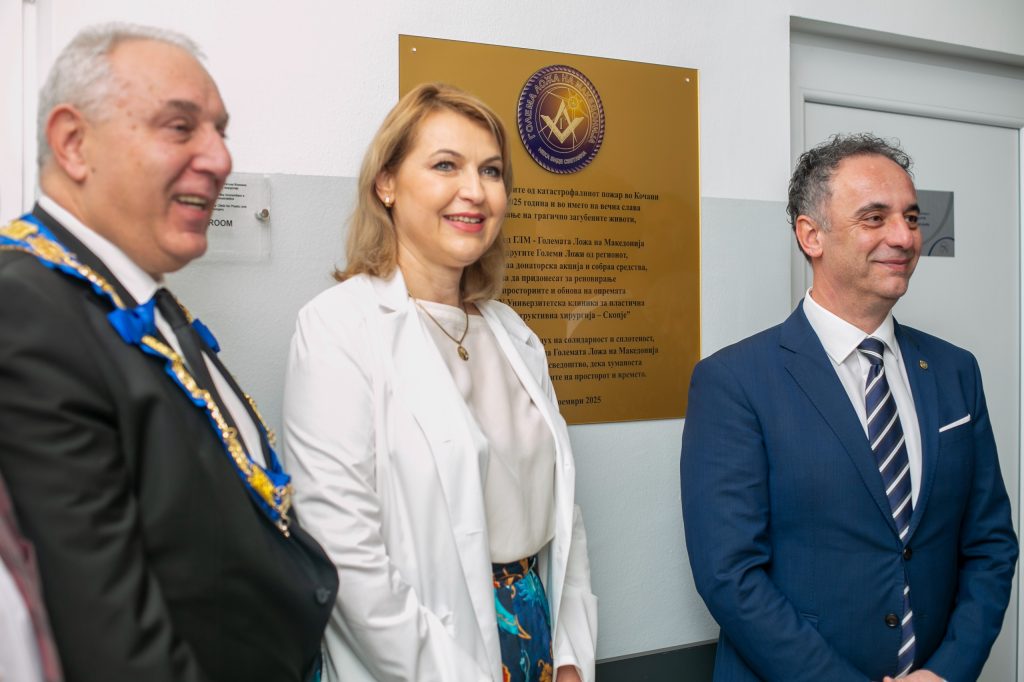 Целосно се реконструирани сместувачките капацитети на Универзитетската клиника за пластична и реконструктивна хирургија. Реновиран е посебен апартман во клиниката, како и собата за преврски, со што пациентите добиваат унапредени услови за престој и третман, а значително е подобрена и функционалноста на просторот, што директно влијае на квалитетот на грижата за пациентите. Со донацијата од Големата ложа на Македонија, во вредност од 25 илјади евра, обезбедена е и нова медицинска опрема, која опфаќа антидекубитални душеци, медицински лопатки, сталаци за инфузија, и други апарати, истакна министерот Алиу при посетата.