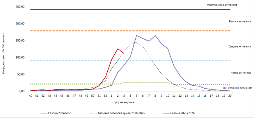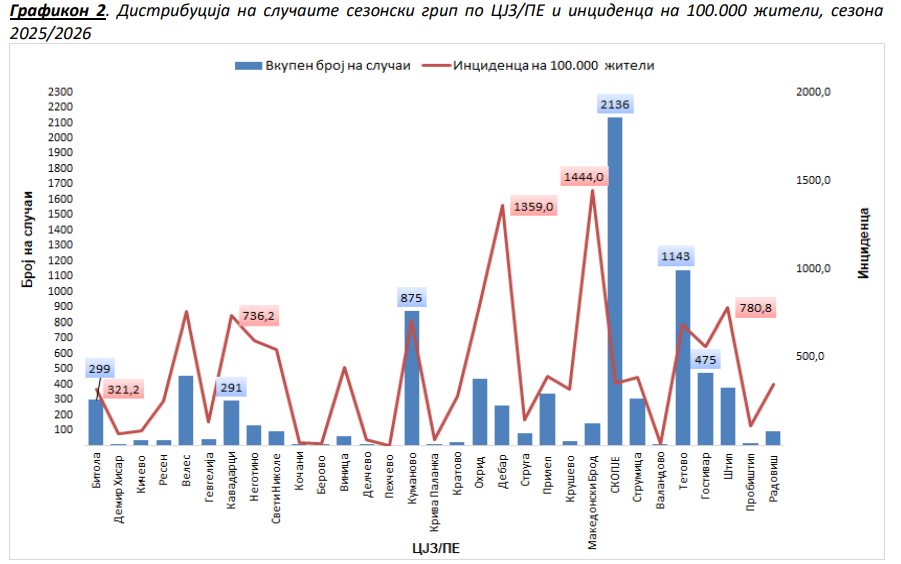 Во сезоната 2025/2026, вкупниот број на случаи на грип – заболувања слични на грип изнесува 8.209, во споредба со истиот период од минатата сезона, бројот на пријавени случаи е зголемен за 2,1 пати, а во однос на моделот од последните 15 сезони се регистрира зголемување од 16,3 проценти.